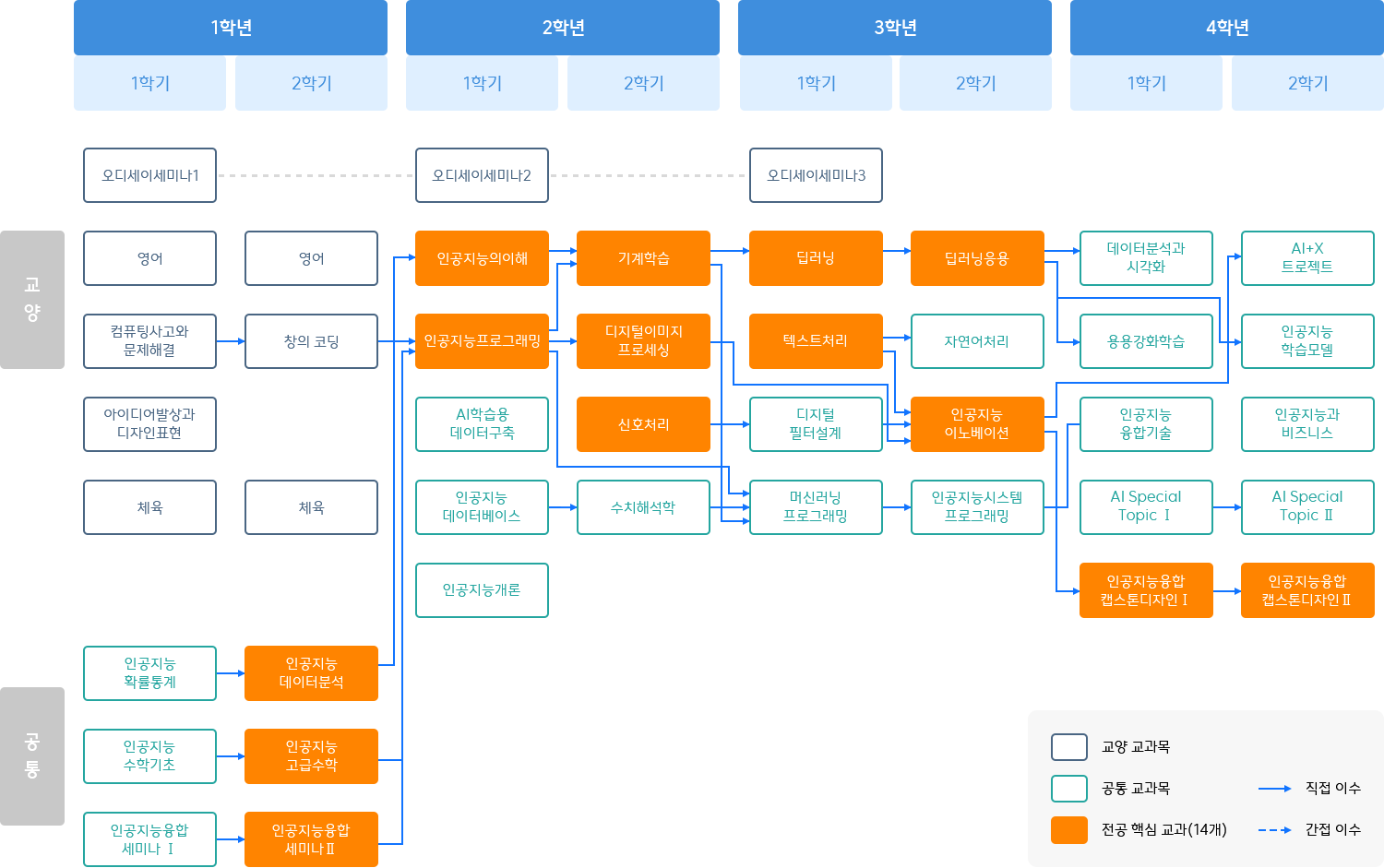 교양/공통과목 필수교과목 단일전공 - 오디세이세미나3, 인공지능융합캡스톤디자인 | 복수전공 - 인공지능융합캡스톤디자인 | 23학번 이전 입학생은 인공지능융합캡스톤디자인 | 또는 Ⅱ 이수 권장. 24학번 이후 입학생은 인공지능융합캡스톤디자인 | 이수 필수. 교양/공통/AI의료 교양/공통/AI로봇 교양/공통/AI기술경영