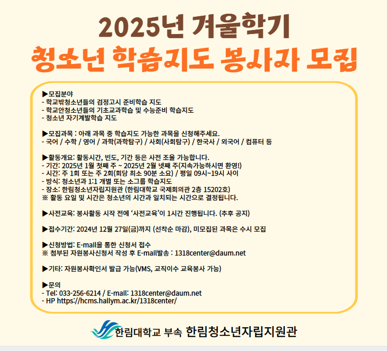 2025년 겨울학기 학습지도 봉사자 모집