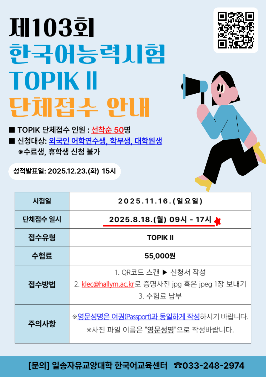 제103회 한국어능력시험(TOPIK) TOPIKⅡ 재학생 단체접수 일정을 안내드리고자 합니다.