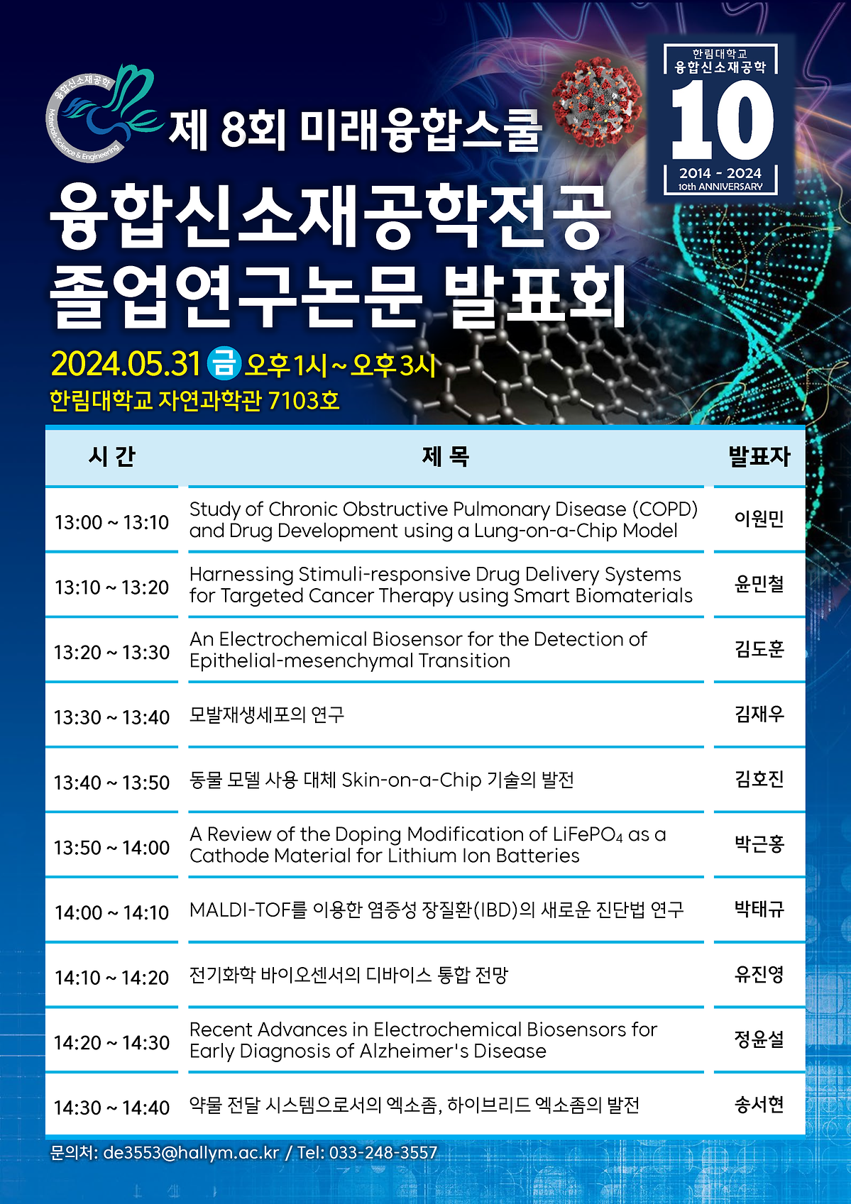 한림대학교 미래융합스쿨 융합신소재공학전공 제 8회 졸업논문 발표회가 2024.5.31에 개최되었습니다.