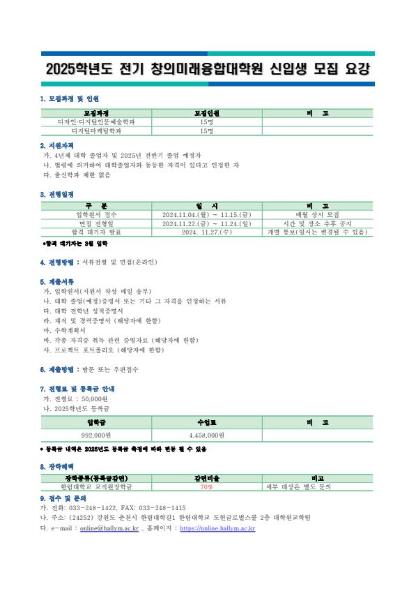 2025학년도 전기 창의미래융합대학원 신입생 모집을 아래와 같이 실시하오니, 많은 지원과 관심 부탁드립니다.