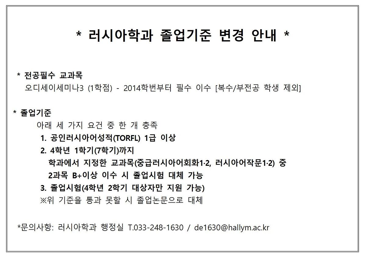 러시아학과 졸업기준이 아래와 같이 변경되었사오니 러시아학과 주/복수/부전공 학생분들은 관련내용 확인해주시기 바랍니다.