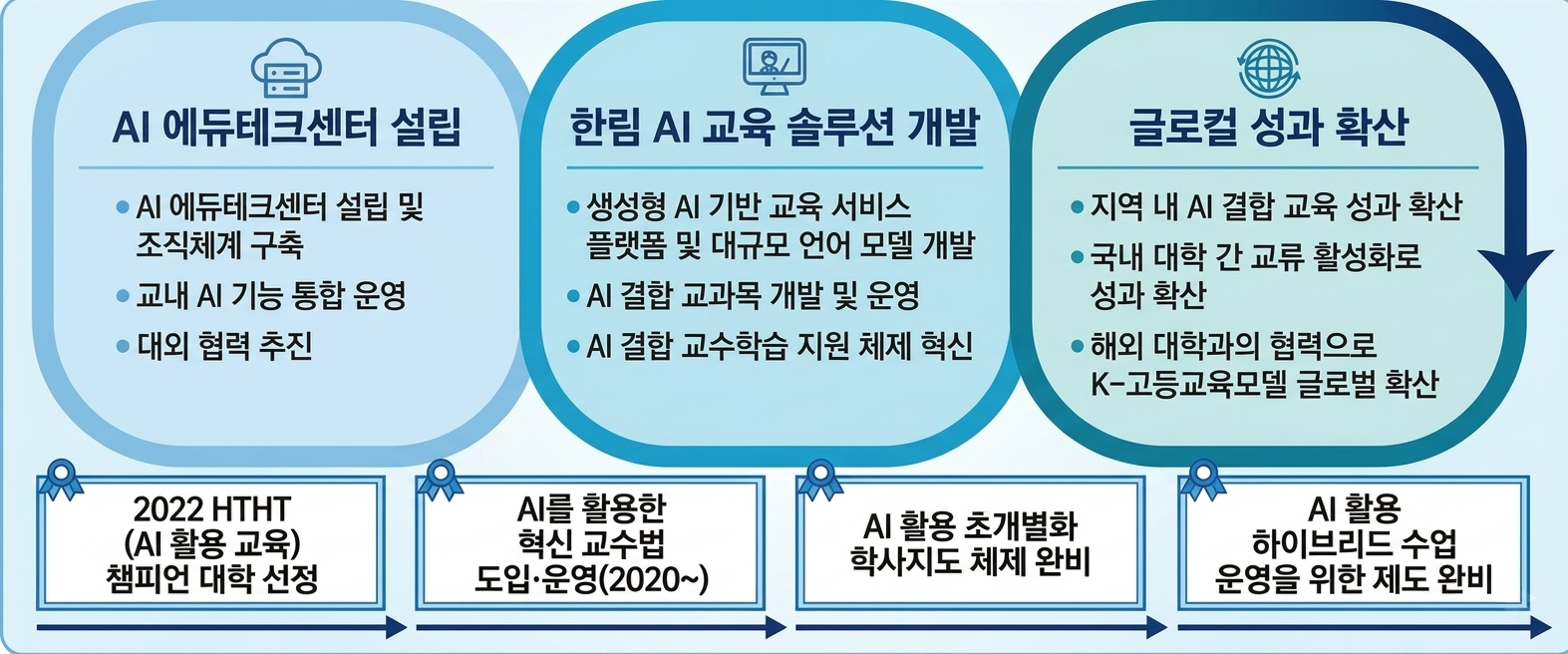 - AI 결합 교과목 개발 및 운영 단계적 확장, 3개년 누적 630개 교과목 운영/수강 학생 2만여 명