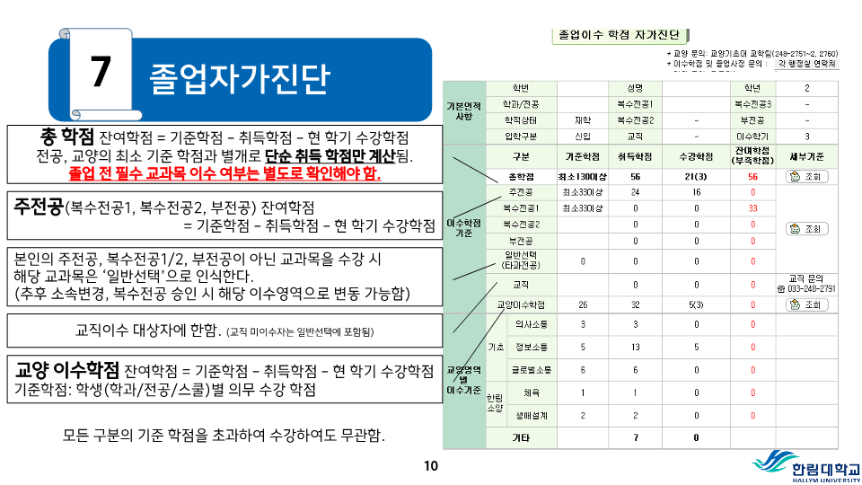fnctId=bbs,fnctNo=487 RSS 2.0 게시물 검색 제목 작성자 검색어 입력창 게시글 리스트 등급기준 등 성적평가 방식 안내 성적<시험>시험은 정기시험, 비정기시험, 추가시험, 재시험 등으로 구분한다.1) 정기시험 : 중간시험과 학기말시험으로 나누며 중간시험은 학기 당 수업일수 2분의 1이 되는 주에 실시하고, 학기말시험은 학기의 최종 주에 실시한다.2) 비정기시험 : 과제학습, 세미나 등 계속적인 학습활동을 평가하는 시험으로 담당교수의 책임 하에 실시한다.3) 추가시험 : 질병 또는 부득이한 사정으로 정기시험에 응시할 수 없는 학생은 사유와 증빙서류를 첨부하여 추가시험신청서를 제출하여 허가를 받아 정기시험 종료 후 2주일 이내에 추가시험에 응시할 수 있으며 이 경우 성적은 B+를 초과할 수 없다.4) 재시험 : 의과대학, 간호대학에 한하여 실시하며 의예과, 의학과 및 간호학과의 교과목 중 학기말 성적이 40-59점일 때 1회에 한하여 학기말시험 종료 후 2주일 이내에 재시험을 허가할 수 있으며, 성적은 C+를 초과 할 수 없다.시험 부정행위자의 처리1) 시험 중 부정행위가 적발되면 감독교수는 그 행위내용을 시험지 상단에 기록하고 날인한 후 즉시 총장에게 보고한다.2) 시험 부정행위자에 대하여는 다음의 내용에 따라 제적 또는 유기정학 처분한다.가) 제 적- 시험에 대리로 응시하거나 대리응시를 부탁한 경우- 시험지에 다른 사람의 이름을 쓰거나 쓰게 한 경우- 부정행위자로 적발되어 징계처분을 받은 사실이 있는 학생이 거듭 부정행위를 한 경우 나) 유기정학- 시험 중 책, 노트, 메모 등 허락되지 않은 것을 본 경우- 다른 학생의 답안지를 보거나 보여준 경우와 그 밖의 부정행위로 인정되는 행위를 한 경우 <성적>성적평가1) 성적평가는 각 교과목의 시험성적, 과제평가, 출석상황 및 학습태도 등을 종합하여 평가하되 출석 및 학습태도 10-20%, 정기시험 50-70%, 비정기시험 및 과제 20-30%로 함을 원칙으로 한다.2) 성적의 등급은 다음과 같이 분류하여 표기한다. 성적 등급 안내등급평점등급평점A+4.5D+1.5A04.0D01.0B+3.5F0.0B03.0P(Pass)없음C+2.5N(Non Pass)없음C02.0 3) 이수한 교과목의 성적이 D0급 이상 또는 P일 경우는 학점을 취득한 것으로 인정한다.4) 등급에 따른 백분위 기준점수 표 등급에 따른 백분위 기준점수 표 등급평점백분위 기준점수A+4.599A494B+3.589B384C+2.579C274D+1.569D164F0595) 전공과목의 성적평가 등급기준 전공과목의 성적평가 등급기준구분A이상B이상C~F비고이론35% 이하70% 이하잔여비율 3-3-0이론+실습40% 이하잔여비율 실습45% 이하 4-2-2예외과목50% 이하잔여비율 *예외과목: 15명 미만 과목, 영어과목, 교직과목 등*잔여비율: 담당교수 재량6) 기초․교양교과목의 성적평가 등급기준 기초․교양교과목의 성적평가 등급기준구분A이상B이상D~F비고일반과목30%60% 이하20%이하 예외과목절대평가 * 예외과목: 20명 미만 과목, 영어과목, RC과목 등* 출석 미달로 인해 F등급을 부여한 학생 및 교환학생은 등급 비율대상에서 제외7) 교과목 주당 수업시간의 3배를 초과하여 결석하였을 때 출석 미달로 F등급을 부여한다. 다만 담당 교수가 3배를 초과하지 않는 범위에서 자율적으로 정할 수 있으며, 수업계획서에 표시해야 한다. 또한, 3회의 지각은 한 번의 결석으로 본다.8) 학기 중 휴학한 학생의 휴학학기 성적은 인정하지 아니하며 그 학기의 수강신청은 취소된다.9) 각 교과목의 담당교수 및 강사는 학기말시험 종료 후 10일 이내에 담당교과목의 성적을 게시하고 통합정보시스템에 접속하여 웹으로 성적입력을 완료하여야 한다. <성적의 정정>1) 제출된 성적은 기재착오(성적의 오기 또는 누락) 등 부득이한 사유가 있는 경우에 한하여 총장의 허가를 받아 정정할 수 있다.2) 성적정정 절차가) 학생은 성적을 조회 확인하여야 하며, 성적에 이의가 있을 경우 담당교수에게 성적이의신청을 하여야 한다.나) 담당교수는 학생으로부터 이의신청을 받은 후 이를 검토하여 사유가 인정될 경우 학기말시험 종료 후 2주 이내에 사유서 및 증빙자료를 첨부한 성적정정원을 교무팀에 제출한다.다) 학생이 성적확인/정정기간에 정정신청을 하지 않은 경우에는 추후 성적에 대한 이의를 제기할 수 없다.3) 방학기간 중 수업, 해외현지수업 등 학기말시험 종료 후 10일 이내에 성적제출이 곤란한 교과목의 경우에는 성적제출 및 정정기간을 따로 정하여 시행할 수 있다. 성적평점평균의 계산1) 과목별 성적평점의 계산은 그 과목의 학점수와 성적등급의 평점을 곱하여 산출한다. 2) 성적평점평균의 계산은 학점을 사용한 가중평균법에 의하며, 소수 세째자리에서 반올림한다.3) 총 성적평점평균의 계산에는 재이수 교과목의 이전 성적은 산입하지 아니한다.4) 취득학점수가 다르고 성적평점평균이 동일한 경우에는 학점계가 많은 학생을 우선한다. 5) 성적등급이 P와 N으로 표시되는 교과목의 학점 및 성적은 성적평점평균 및 순위계산에서 제외한다.<성적경고와 유급, 우등생>1) 성적경고 가) 학기말 성적평점평균이 2.00 미만(의예과 2.20 미만)인 경우에는 예비성적경고를 한다.나) 신입생의 1학년 1학기 성적경고는 적용하지 아니한다. 다만, 의예과 학생은 